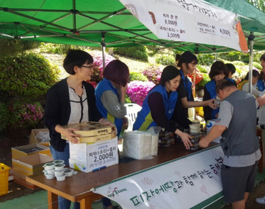 ㈜에땅(회장 공재기)이 5월 7일 시립 은평의 마을(시설장 이향배)에서 열린 ‘제 50회 봄 먹을 거리 장터’에 참석해 피자와 치킨으로 나눔을 실천했다.