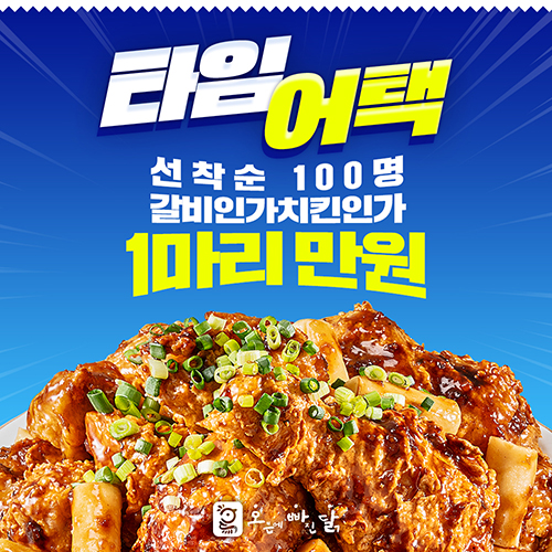 오빠닭은 5월 1일부터 티몬에서 타임어택과 할인 판매 이벤트를 진행한다. 타임어택 이벤트로 오빠닭의 신메뉴 ‘갈비인가 치킨인가’를 100개 한정으로 정상가 1만9900원의 절반할인 가격인 1만 원에 판매할 예정이다.