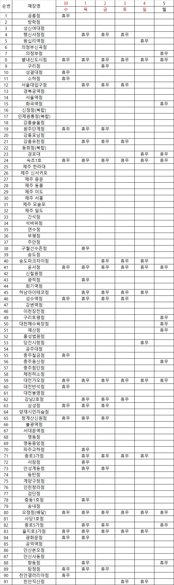 2020 추석 연휴 휴무 매장 안내 입니다.