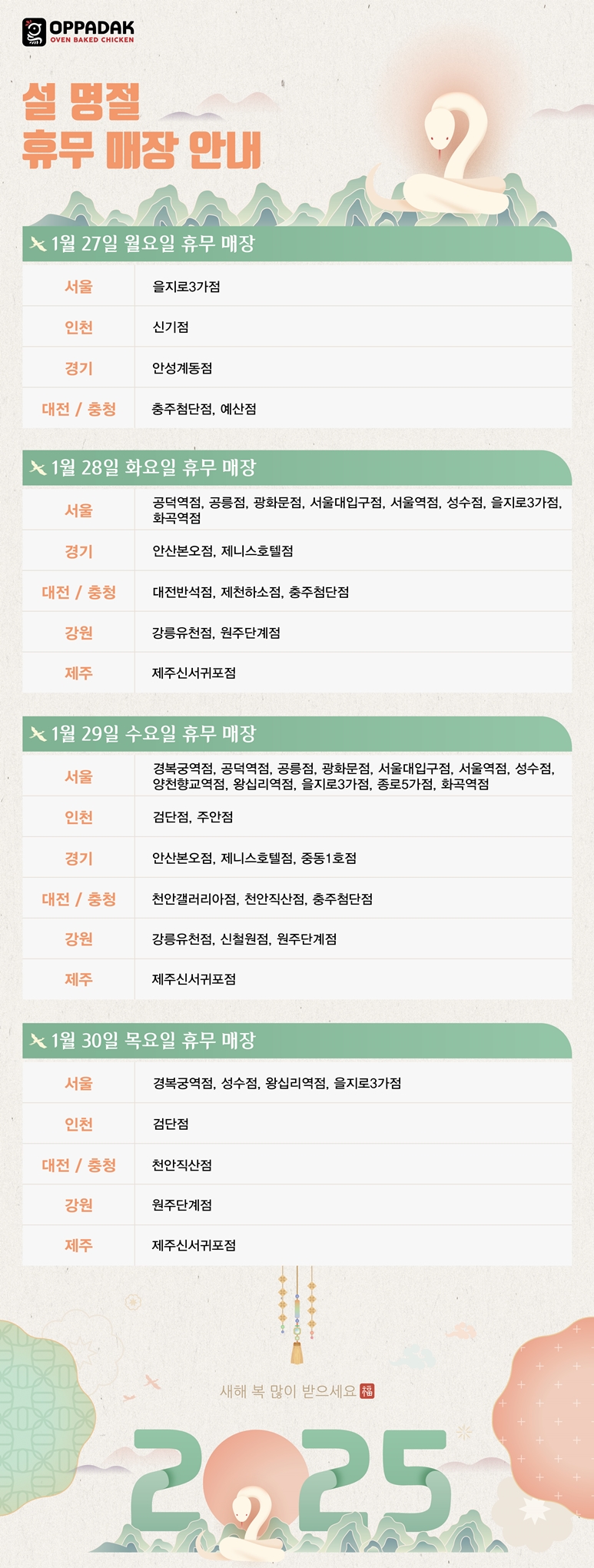 2025년 설날 휴무매장 안내